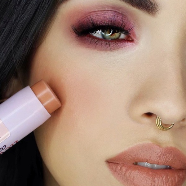 Blush in stick multiuso rosa beige a sottotono malva.