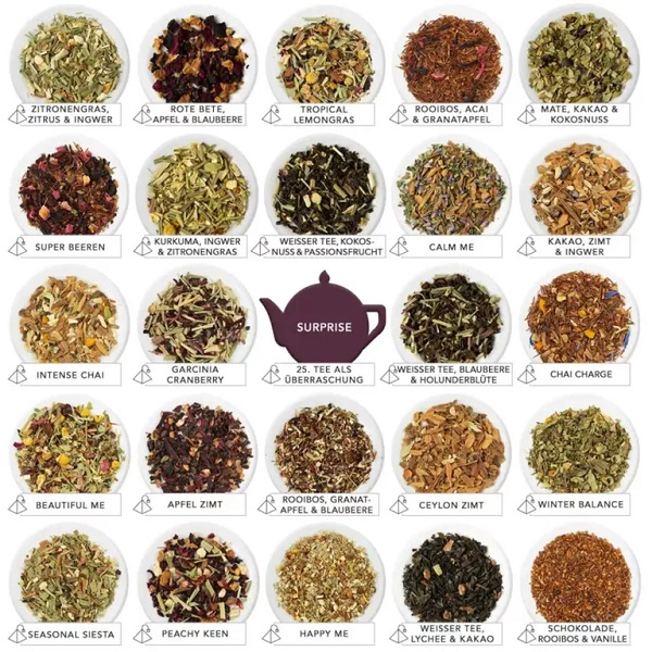Irish Holiday: Tè nero, pezzi di cannella, orzo tostato, pezzetti di zenzero, aroma di vaniglia, aroma di panna irlandese Silent Night: Tè verde, pezzi di cannella, pezzetti di zenzero, foglie di menta piperita, petali di rosa, aroma di menta. Gingerbread Man: tè nero, orzo tostato, pezzi di cannella, pezzetti di zenzero, pezzi di mela, aroma di zenzero, aroma di cannella, aroma di lime. Savoury Blend: Tè nero, pezzi di cannella, mela a pezzi, Liquirizia, aromi naturali, buccia di arancia, rosa canina, baccelli di vaniglia. Sleigh Ride: Tè verde, pezzi di cannella, pezzi di zenzero, pezzi di cardamomo, pezzi di noce moscata, pepe, chiodi di garofano, sapore di anice, sapore di arancia. Tè Nero con Miele e Melone: Tè nero, Liquirizia, pezzi di cannella, aroma di miele, aroma di melone. Spicy Pumpkin: Tè verde, pezzi di cannella, pezzi di zenzero, pezzi di cardamomo, chiodi di garofano, semi di anice, pezzi di noce moscata, pepe nero, aroma di cannella, aroma di arancia, aroma di melone. Spicy Anise: Tè nero, pezzetti di zenzero, chiodi di garofano, aroma di zenzero, aroma di menta, aroma di anice. Holiday Blend: Tè nero, pezzi di cannella, pezzi di zenzero, pezzi di cardamomo, pezzi di noce moscata, pepe, chiodi di garofano, bucce d’arancia, aroma di vaniglia, aroma di mela. Menta Piperita e Melone: Tè verde, pezzi di cannella, Liquirizia, foglie di menta piperita, aroma di melone. Happy Holiday: Tè verde, pezzi di cannella, pezzi di zenzero, pezzi di cardamomo, pezzi di noce moscata, pepe, chiodi di garofano, pezzi di melograno, aroma di citronella, Sapore di melograno. Candy Cane: Foglie di menta piperita, tè verde, buccia di arancia, pezzi di cannella, cicoria tostata, aromi naturali, vaniglia in baccelli. Breakfast Special: Tè nero di Ceylon. (Tutti gli ingredienti sono di origine biologica).