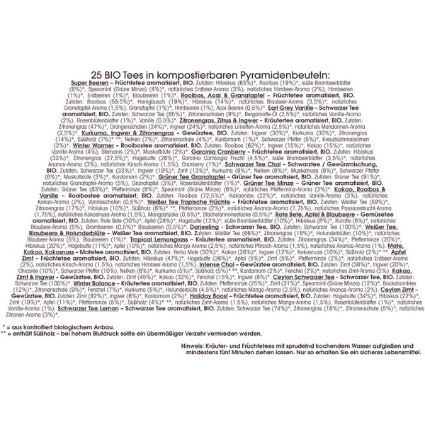 Sia le confezioni in cartone che le bustine piramidali sono prive di plastica e completamente compostabili. Le 24 diverse miscele, a base di ingredienti biologici di alta qualità, contengono vari tipi di tè, erbe, frutti e spezie, tra cui non può mancare il rooibos.
