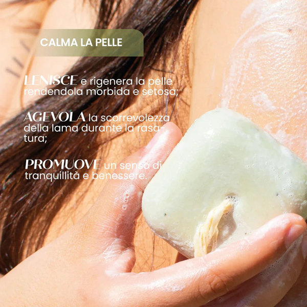 Durante l’utilizzo, il panetto crea una schiuma soffice e cremosa che avvolge la pelle con una sensazione di comfort e relax.