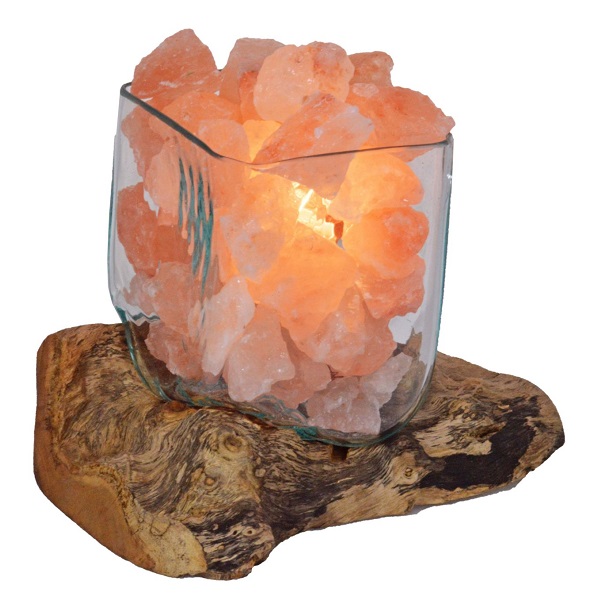 Lampada di Sale Himalaya UNICA Vetro su Legno Cubica Voganto