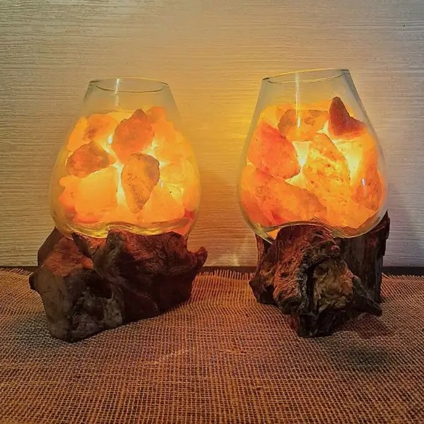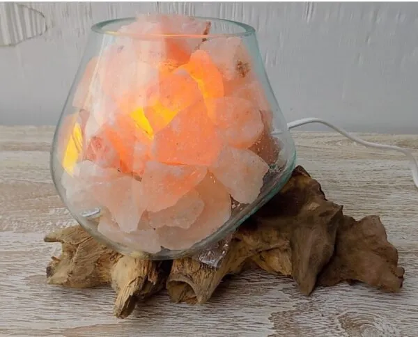 Lampade di Sale Himalaya UNICA Vetro su Legno Grande Vogantoย cm ร23 DA 5 A 6 KGย