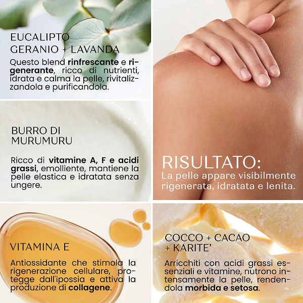 Prunus Amygdalus Dulcis Oil*, Caprylic/Capric Triglyceride, Cetyl Alcohol, Cetearyl Alcohol, Cocos Nucifera Oil, C13-15 Alkane***, Cetearyl Olivate, Theobroma Cacao Seed Butter, Astrocaryum Murumuru Seed Butter, Butyrospermum Parkii Butter, Lavandula Angustifolia Oil, Eucalyptus Globulus Leaf Oil, Pelargonium Graveolens Flower Oil, Tocopherol, Sorbitan Olivate, Hordeum Vulgare Seed Flour, Helianthus Annuus Seed Oil, Linalool**, Citronellol**, Geraniol**, Limonene**** | * da agricoltura biologica | **naturalmente presente negli oli essenziali | ***di derivazione naturale