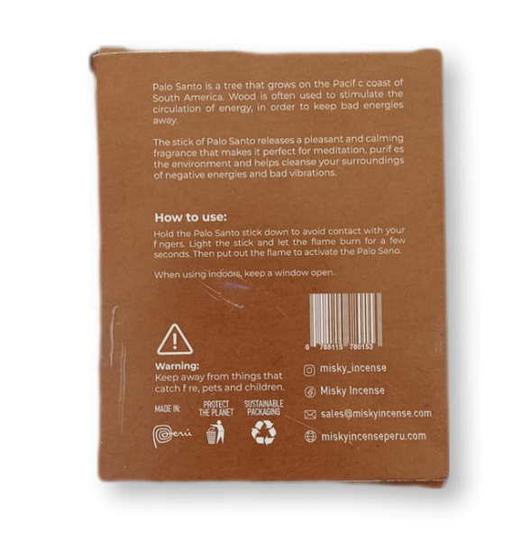 E’ confezionato in una scatola 100% ecologica, in linea con l’impegno di Misky Incense Naturals per la sostenibilità e il rispetto della natura. Il Palo Santo peruviano utilizzato proviene esclusivamente da alberi che muoiono naturalmente, secondo gli standard ambientali certificati dall’Amministrazione Forestale del Perù. Acquistando questo prodotto, sostieni il commercio equo e solidale e contribuisci alla salvaguardia delle tradizioni locali.