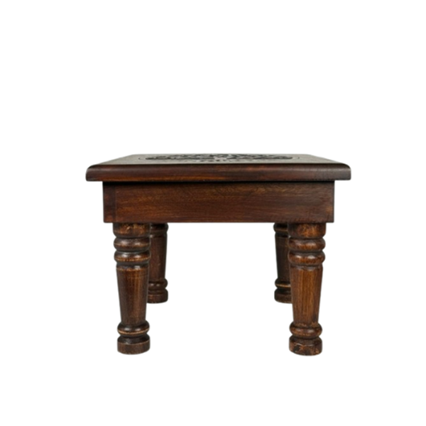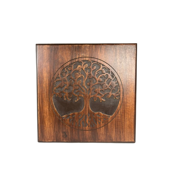 Il tavolino è realizzato in legno naturale lavorato artigianalmente, con incisione decorativa dell’Albero della Vita.