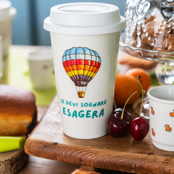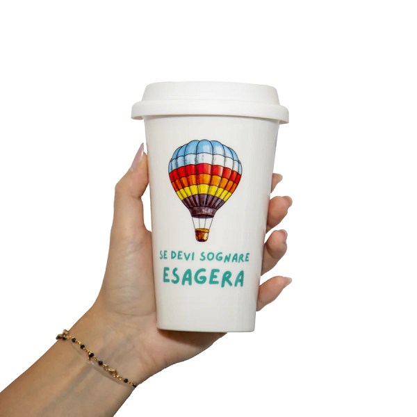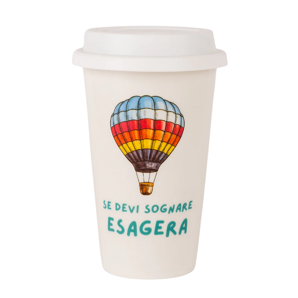Tazza Americana In Ceramica Mongolfiera IdeaForProject Ideale per Bevande Calde e Fredde Con Tappo a Chiusura Ermetica In Silicone