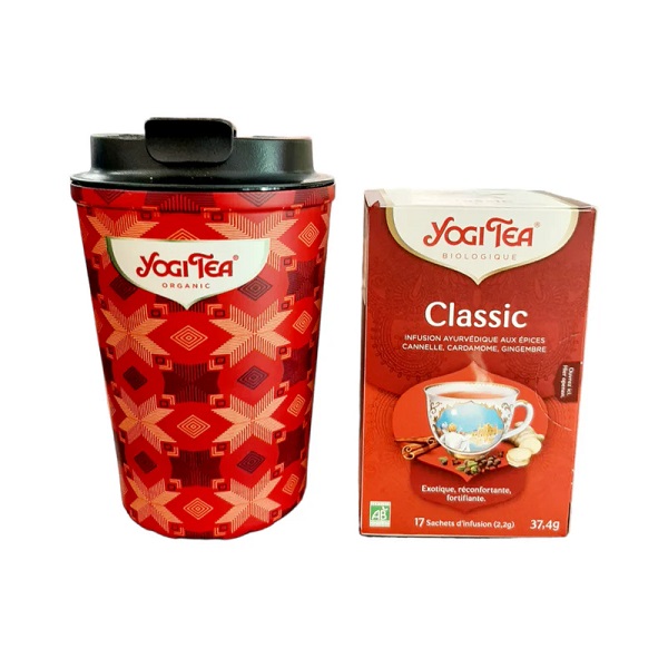 La tazza termica è realizzata con materiali durevoli e conserva a lungo il calore della tua bevanda preferita, mentre l’infuso Classic di Yogi Tea, realizzato con ingredienti biologici e ayurvedici, ti offre un’esperienza sensoriale autentica, perfetta per calmare la mente e rilassare il corpo.
